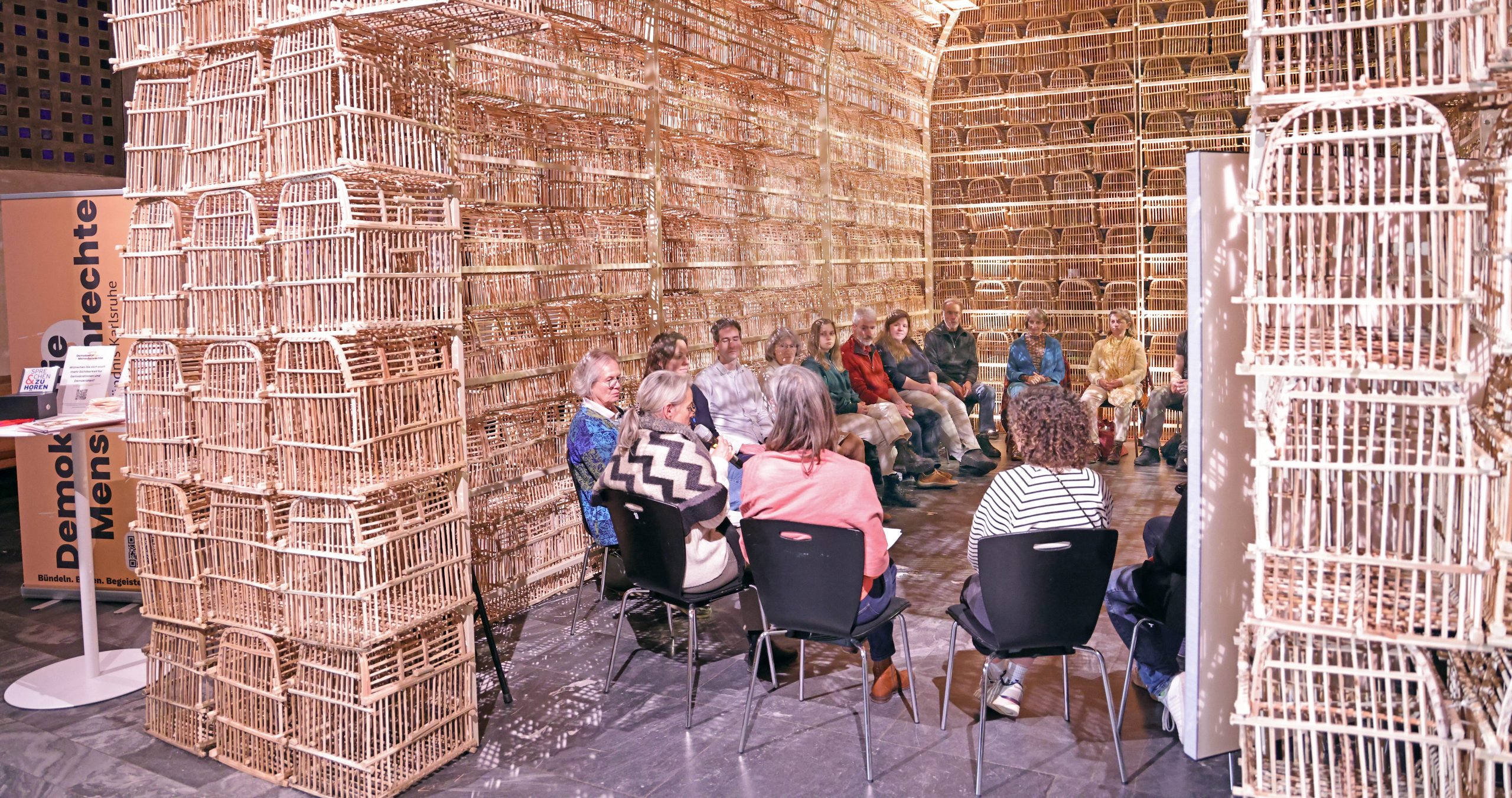 Und das nicht irgendwo, sondern in der Installation „THE CAGE“ des in Karlsruhe lebenden irakischen Künstlers Fahar al-Salih, welche anlässlich der Internationalen Wochen gegen Rassismus in der Evangelischen Stadtkirche am Karlsruher Marktplatz aufgebaut ist. Die Botschaft des Kunstwerks rund um Themen wie Freiheit und Begrenzung haben auch hätten dabei nicht passender für die zweite Ausgabe von „Sprechen & Zuhören im Quartier“ sein können.