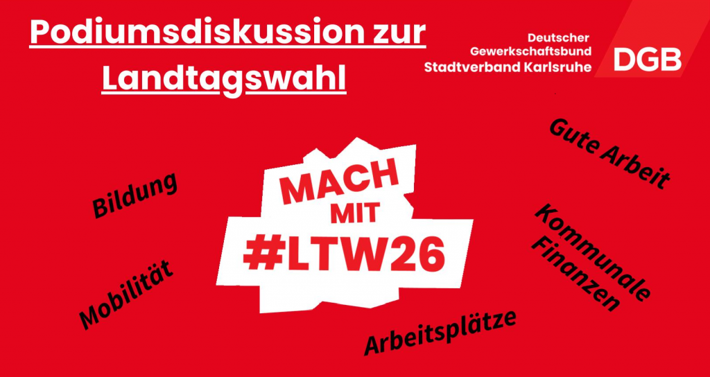 Am Do. 22.01.26 um 16:30 veranstaltet der DGB-Stadtverband Karlsruhe in der Fassabfüllung der Hoepfner Brauerei eine öffentliche Podiumsdiskussion zur Landtagswahl. Mit dabei sind Bündnis 90/ Die Grünen, CDU, SPD, FDP und Die Linke. Veranstaltungsadresse: