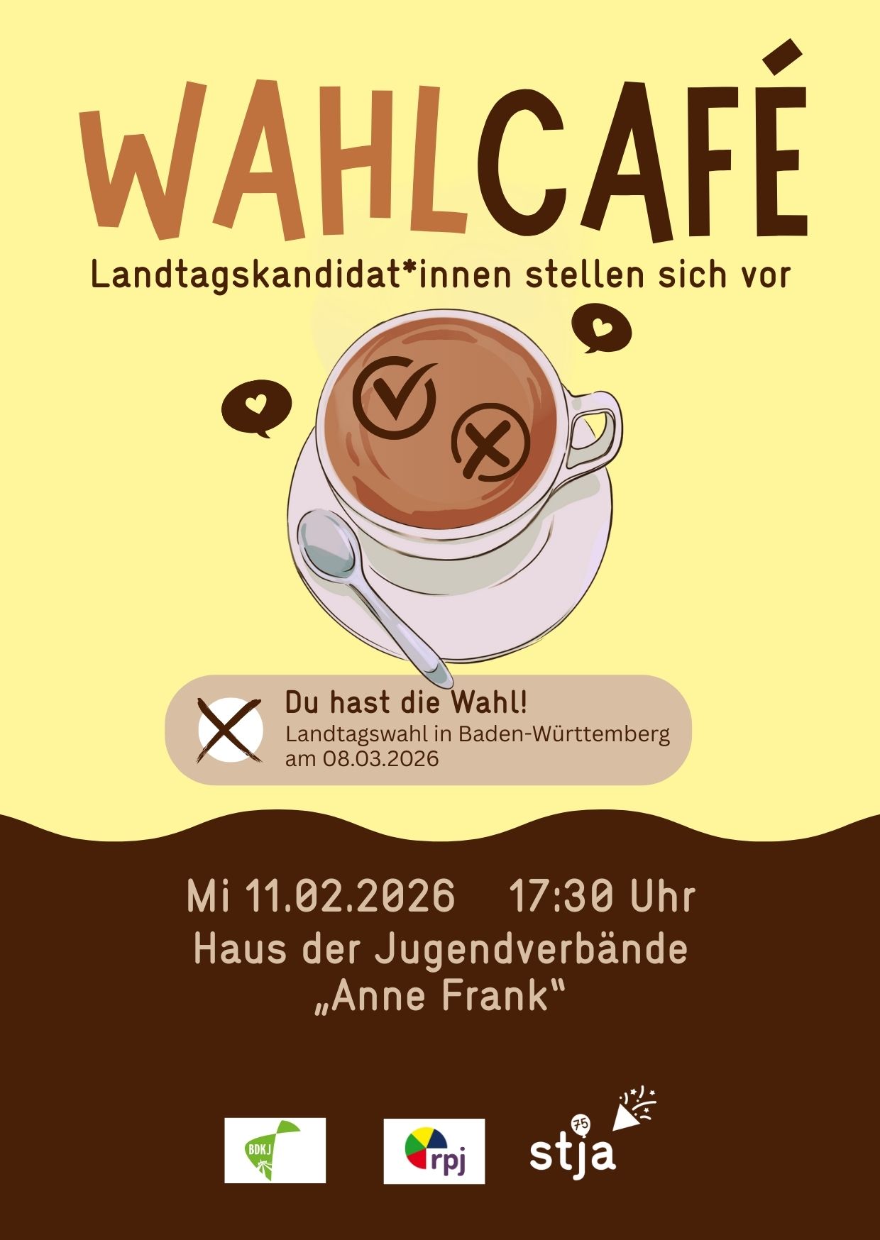 Der Stadtjugendausschuss (stja) veranstaltet gemeinsam mit BDKJ (Bund der Deutschen Katholischen Jugend) und dem RPJ (Ring politischer Jugend) ein „Wahlcafé“ mit Kandidierenden für junge Wähler*innen am Mi. 11.02. um 17:30 Uhr im Haus der Jugendverbände „Anne Frank“, Moltkestr. 20. Kontakt: b.ebert@stja.de